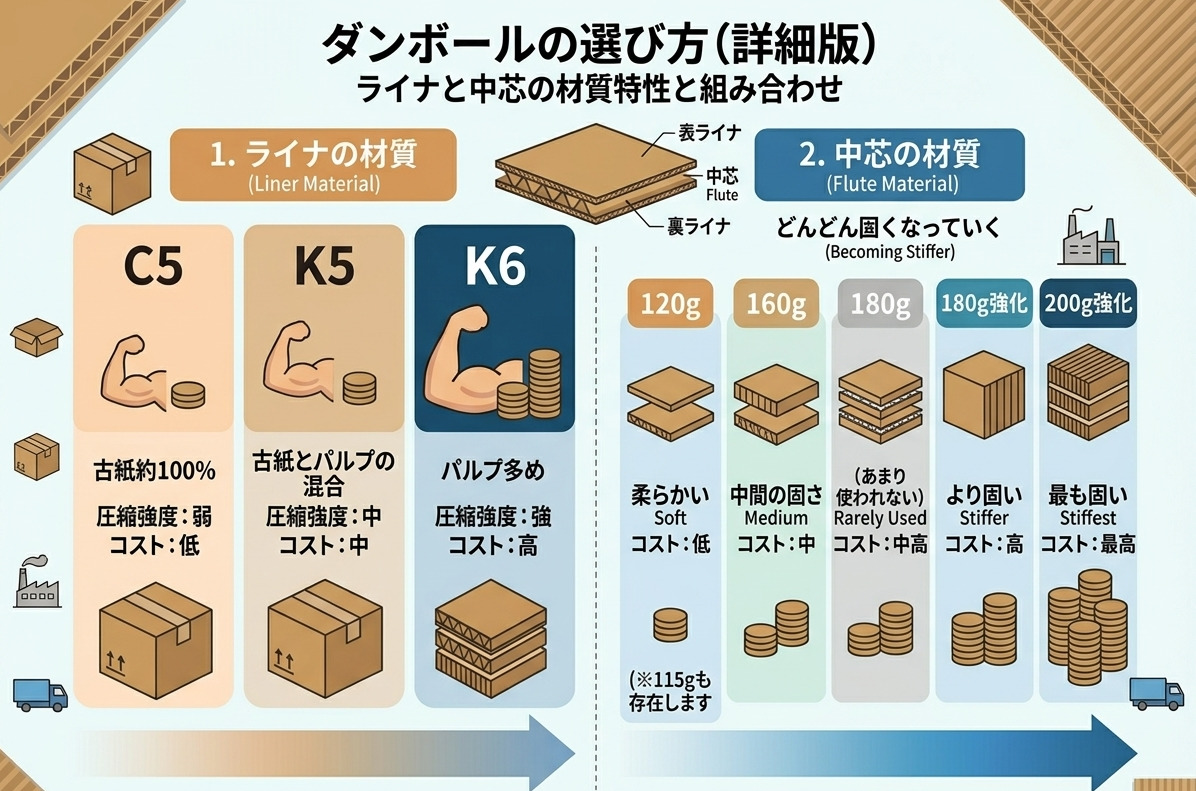 例えば、段ボールの厚みを変更して箱全体の強度を高めたり、強化芯を使用することで強度を上げる方法があります。製品の重量や輸送条件に応じて材質や構造を調整することで、必要な強度を確保しながら過剰な仕様にならない設計ができると学びました。