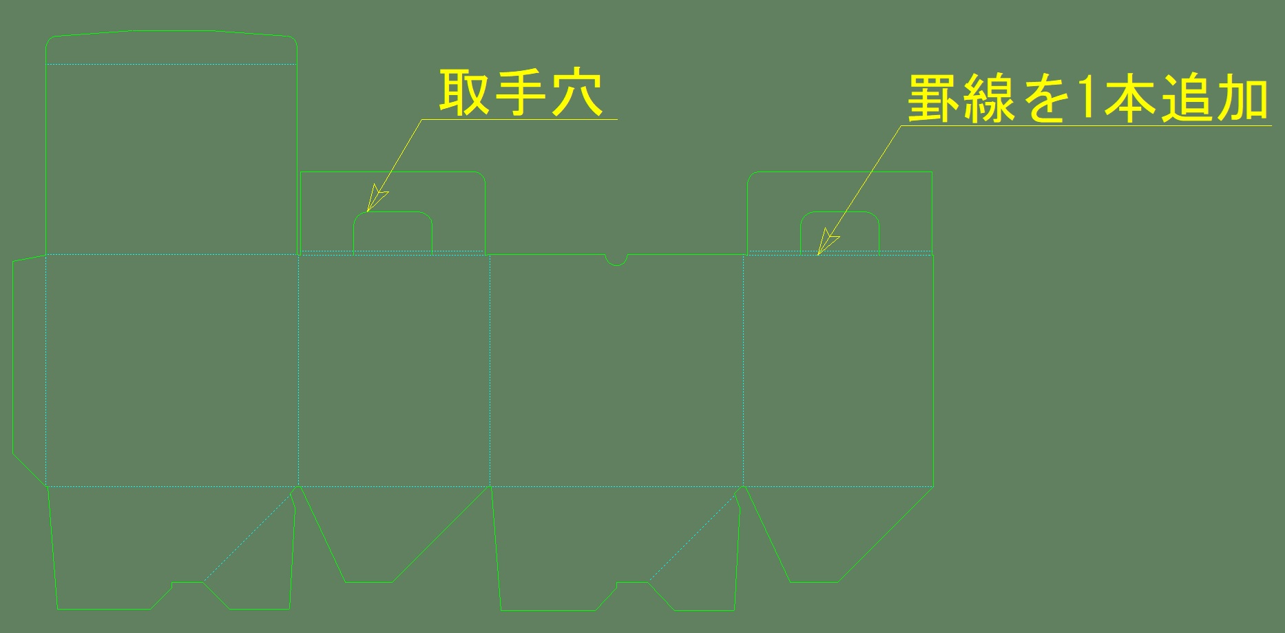 取手穴+罫線を追加した図面です。図面上では図のように少し工夫するだけで取手が付くような構造になります。